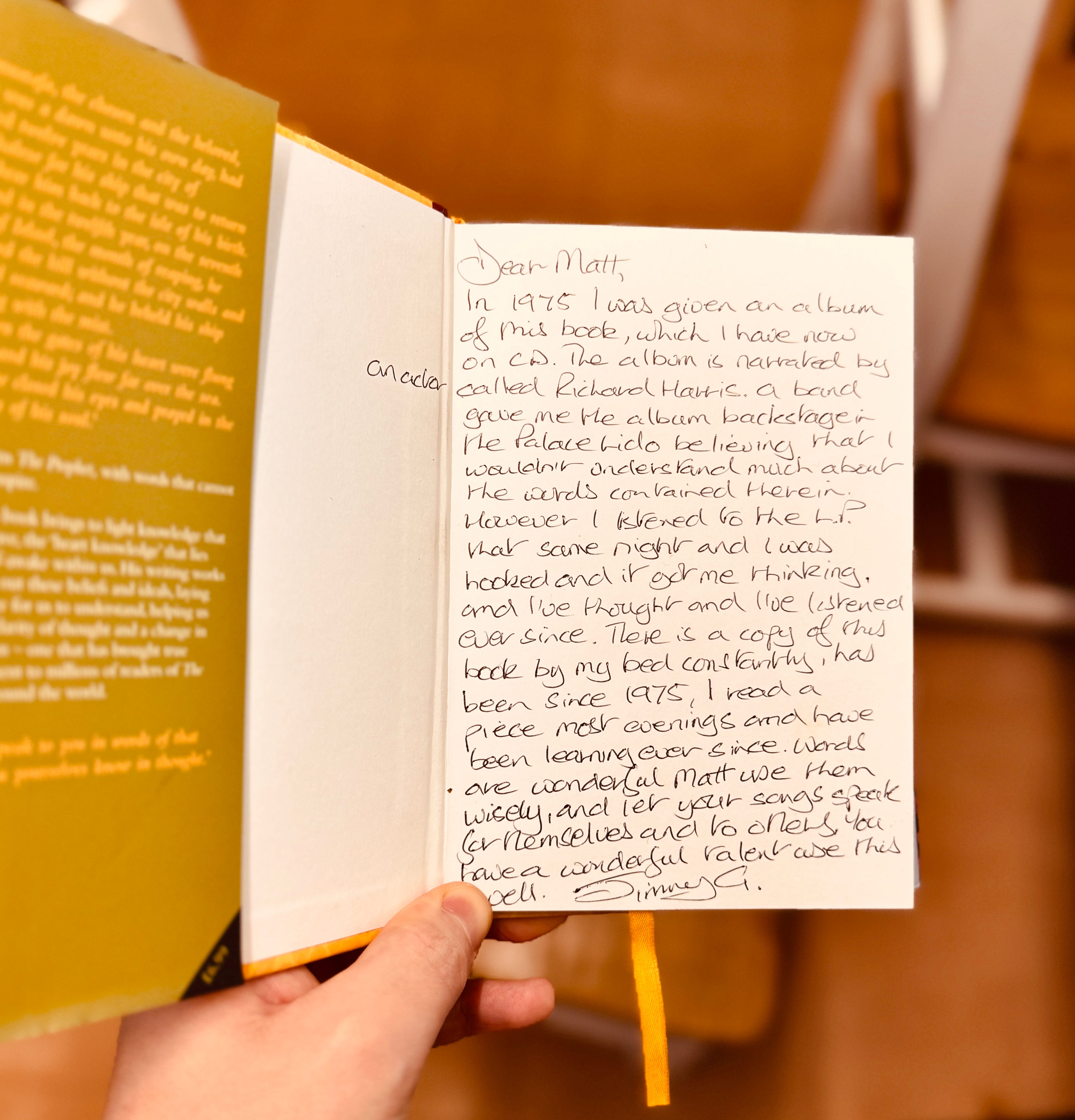 June hands him a book. A pale cover with a face imprinted: The Prophet by Kahlil Gibran. Just the title alone felt like a door. The care worker sat next to me, tapped my arm, and said all the best songwriters have a copy of that book. A word which promised knowledge. A hidden map. Prophet. Someone who knows. Someone who sees what other people can’t.